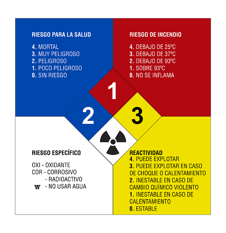 La norma NFPA 704 es la que nos ayuda a identificar y clasificar los diferentes tipos de sustancias químicas, “ya sea para el transporte o el almacenamiento”, proporcionando información básica sobre los peligros que la componen, por medio de métodos especiales, visuales “color y formas” y numéricos. Esta norma se explica mediante un rombo o diamante compuesto por 4 colores, cuyo riesgo se identifica con una escala numérica, donde 0 expresa que no hay riesgo y 4 que su riesgo es muy alto. Estos avisos actúan como un sistema de advertencia inmediata para el personal que la manipula, abordando la salud “azul”, la inflamabilidad “rojo”, la inestabilidad “amarillo” y los riesgos especiales “blanco” que pueden estar presentes.